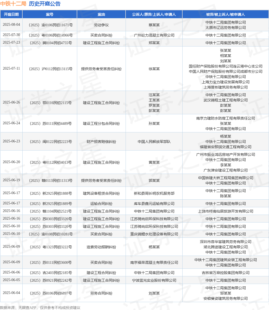 本站消息,根据天眼查APP显示,近日公布了一则中铁十二局集团有限公司作为被告/被上诉人的开庭公告,详细内容如下: